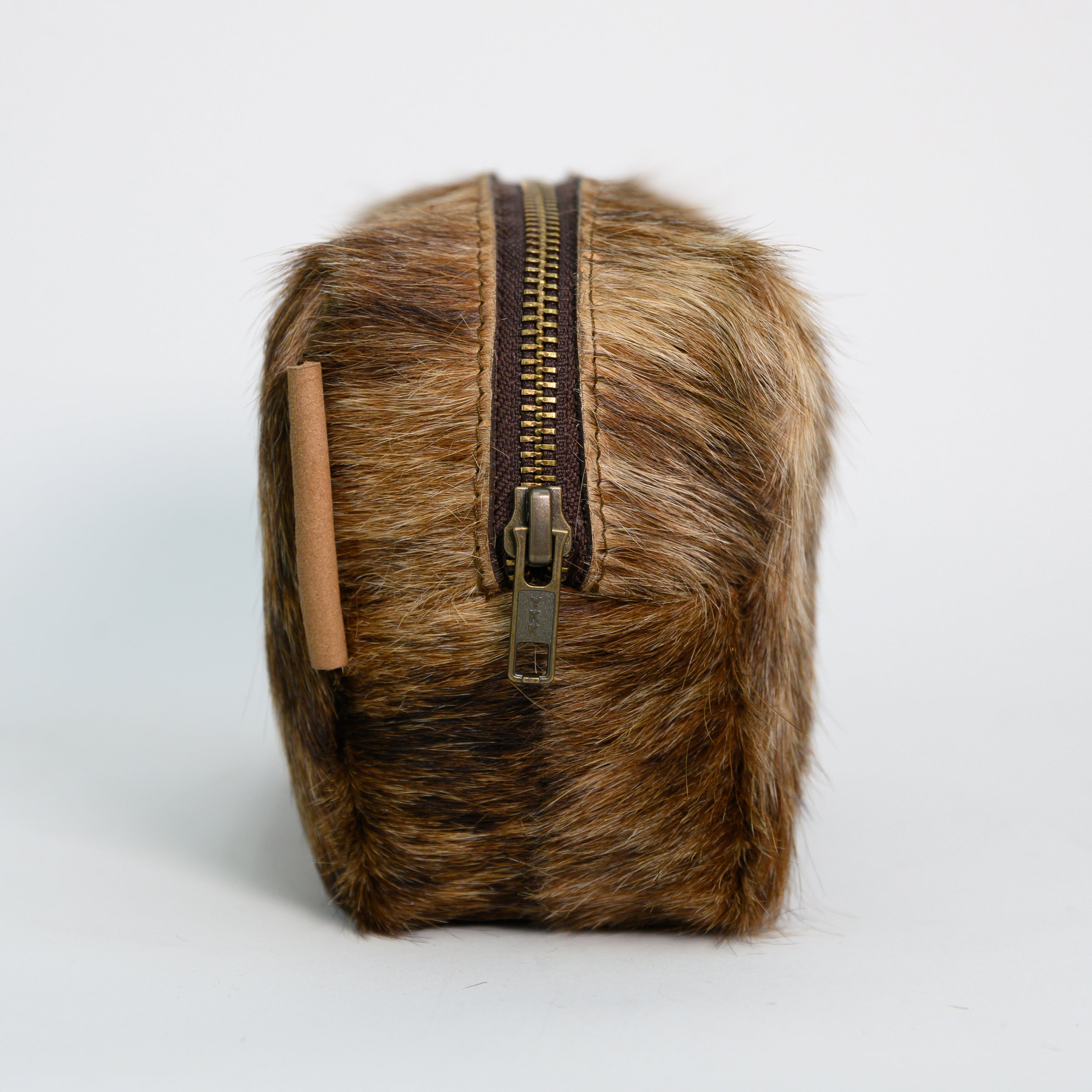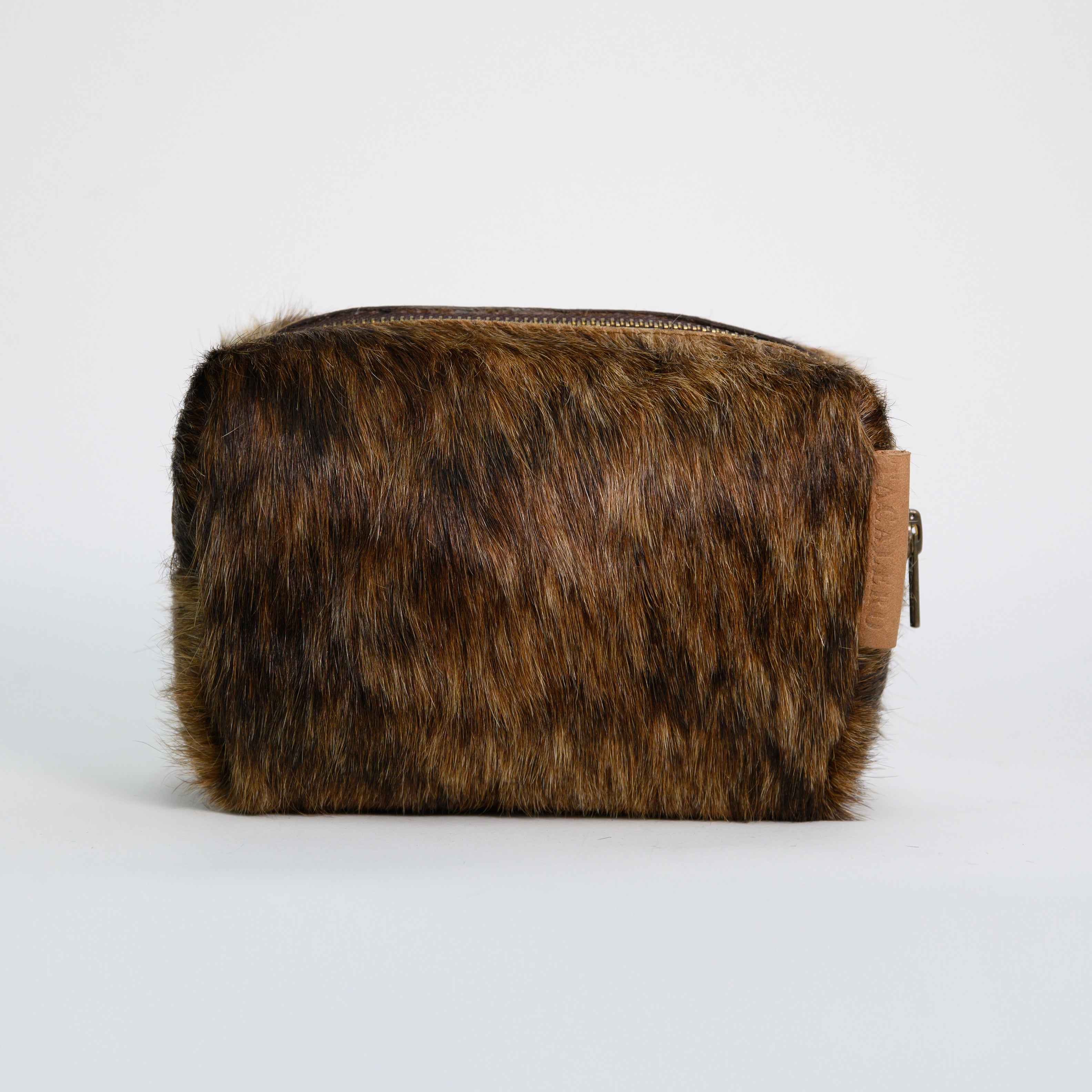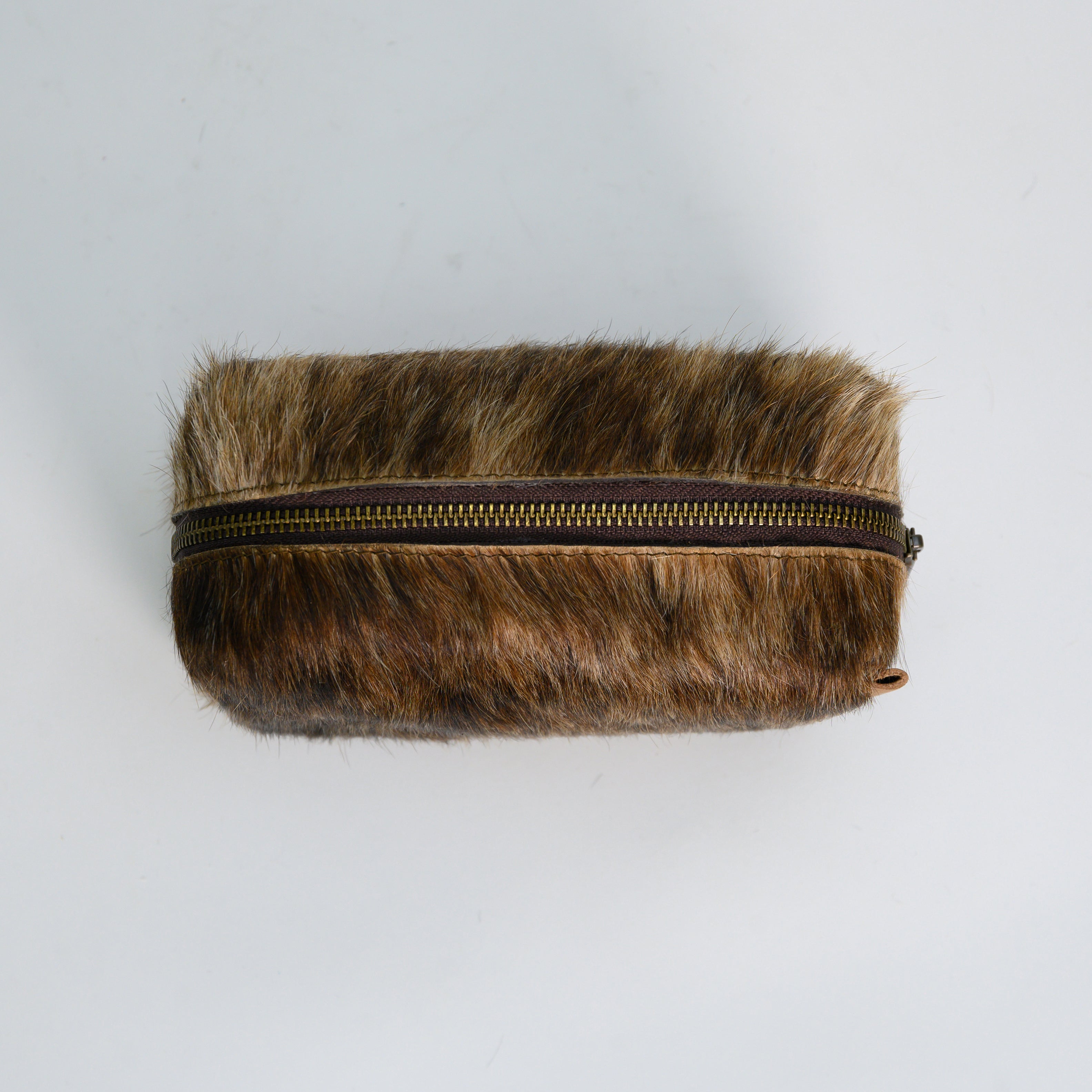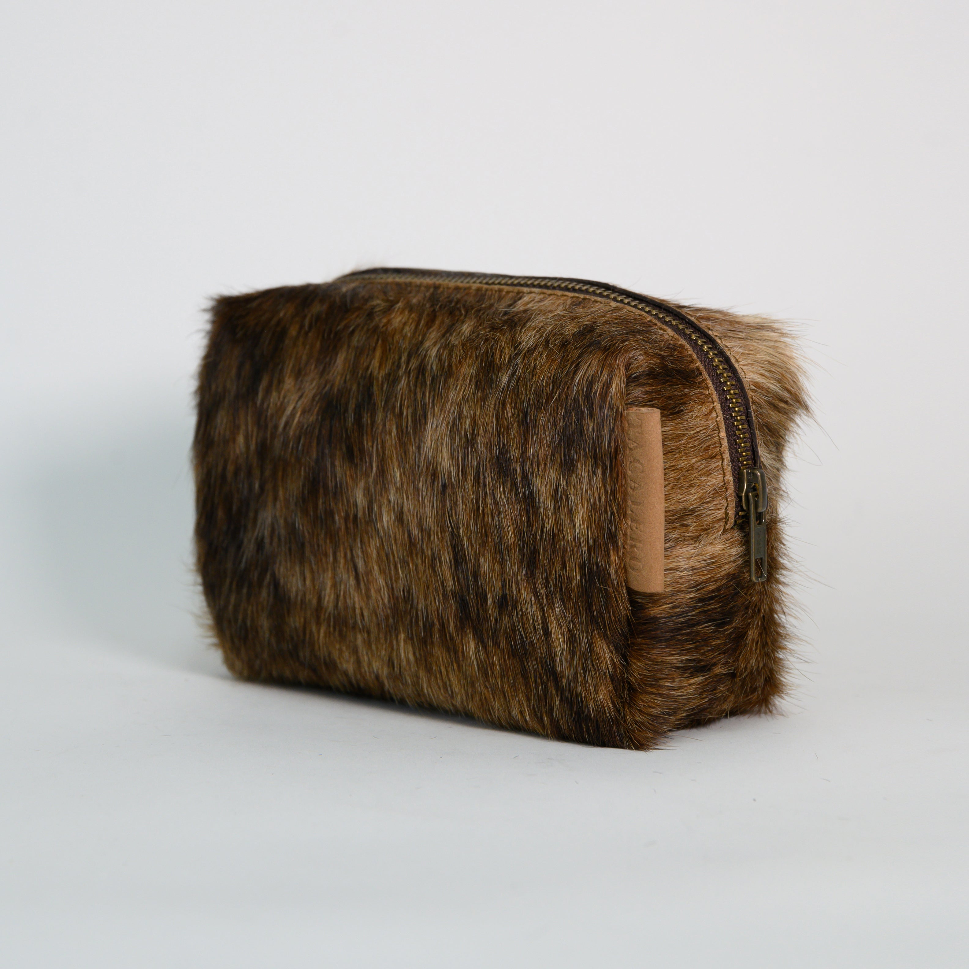 Genuine cowhide cosmetic bag with brown fur. Color and print variations may occur. Solid metal closure.